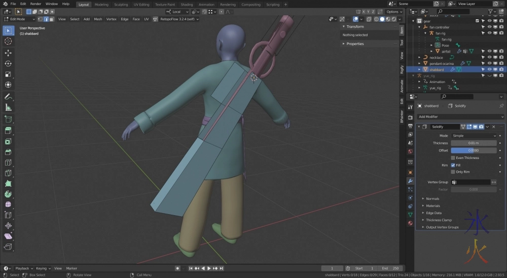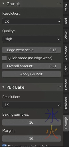 My friend Abdoubouam kindly gifted me their Grungit add-on a couple of years ago and I finally got around to playing with it (yeh I know I really am a terrible friend x_x). It’s what’s responsible for the scratches and wear on the airfoil and the ocarina. After I figured it out I told 16yo and GM that I was going to have to do some crowing for them because I don’t think I can do without this thing now. It was pretty easy to pick up, just install and a panel appears for it in the N panel. You select the object you want to grunge, check and adjust settings and press “Apply”, and it makes maps for you if there aren’t some for it to use already.