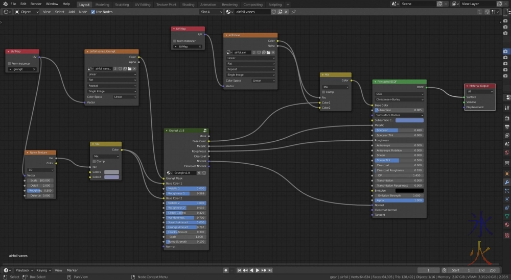 It then neatly inserts nodes (I only used the grunge node, there is also a dirt node if you want to make things dusty/dirty but Yue keeps her equipment pretty clean, the ocarina is quite old and the airfoil is banged up from a lot of use) into your existing textures and you can then adjust the settings on that node to fine tune. There’s also options to add masking maps (which I haven’t needed to use yet).