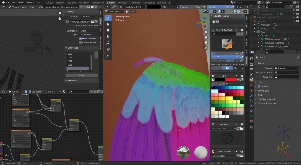 Then I’m going to version save, chop off the poor guy’s right arm and paint some scars on him.On the AER side of things I made some decent progress on Zara’s seemingly neverending tattoo and only have a handful of blue feathers left.