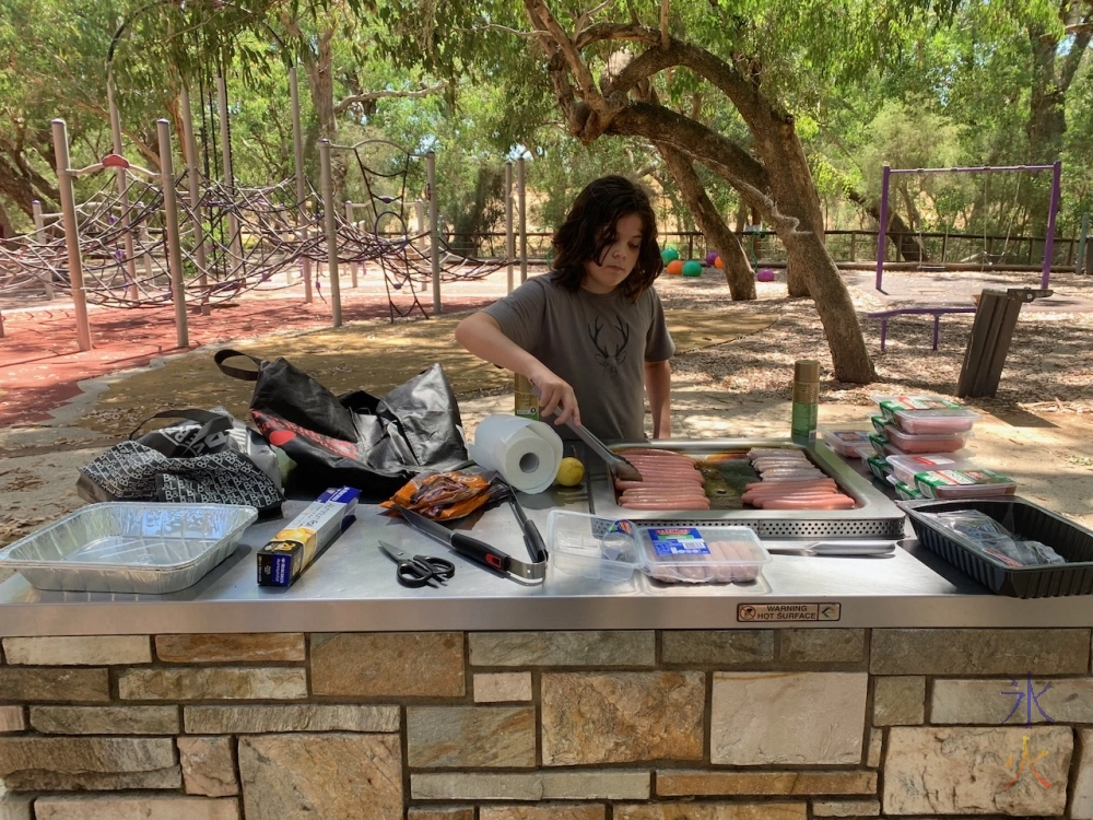 He did everything from the very beginning of sterilising the hotplate with lemon juice (which had to be done twice because he didn’t realise he should cook the vegetarian ones first, fortunately we had brought three lemons) through to cooking every single sausage. I helped a little bit by keeping him company, opening packets and cutting up sausage strings when I was able to stay there (I was doing some other scurrying), organising the sausages into neat little rows on the baking tray when he was in too much of a hurry to just get them off when they were done cooking and carting said baking trays back to the amphitheatre (we were on the other side of the park where the barbeques were).