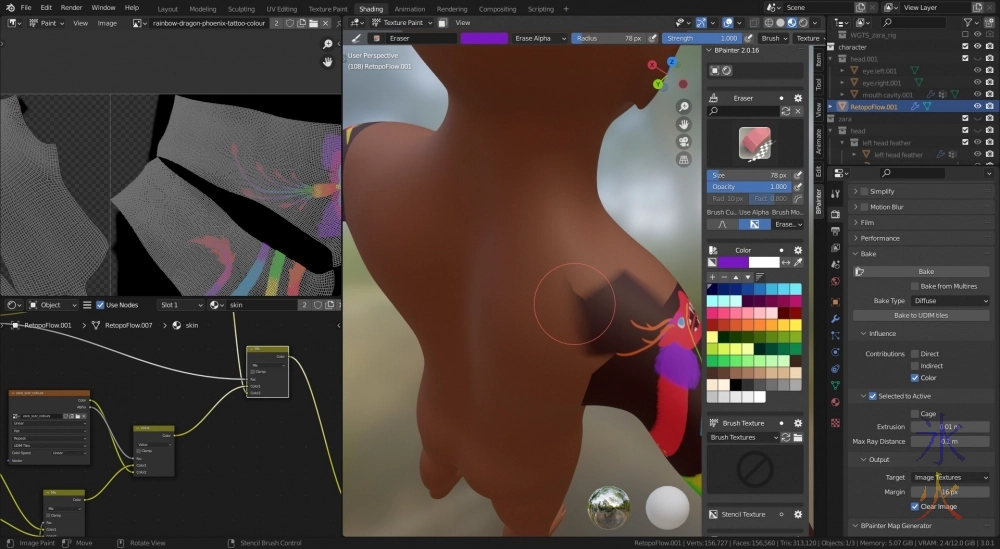 AER moved a little bit, I figured out how to bake the tattoos onto the new model (and will be able to fix the low res problem bits, the new uv map is definitely better than the old one) which was basically the same process as baking normals (though I use UDIMs now so it’s a different button)