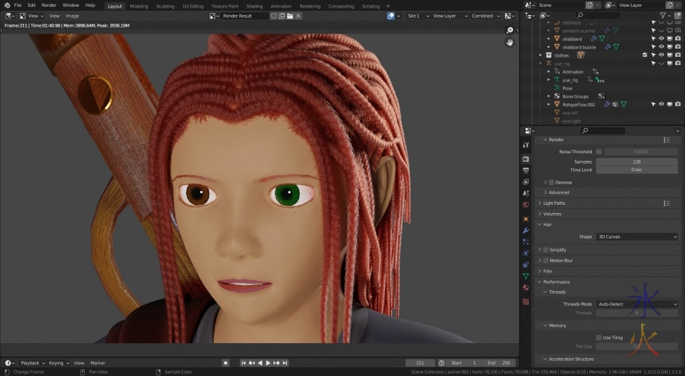 The hair is still on quick settings because I just wanted to see how it looked, for a shot this close I would switch to 3d curves which looks a lot better but takes a bit longer to render.