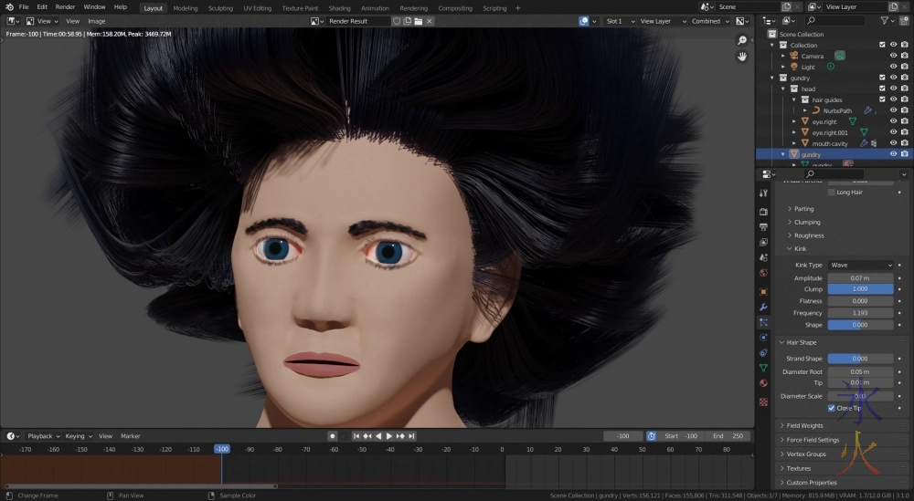 I’ll see what happens with the hair dynamics after combing the lot into position (ergh) but if worse comes to worse I do know how to shape it reasonably quickly with curve guides (I call it “the hard way” not because it’s hard but because it’s fiddly and tedious) but I haven’t yet figured out how to make the curves work as soft bodies (which is theoretically a thing that can be done) which should (theoretically) make them easier to animate.