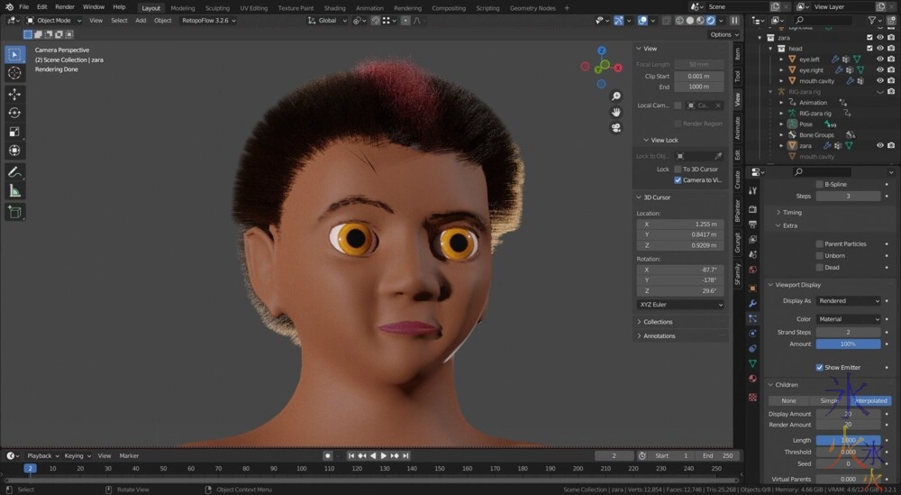 Meanwhile I wanted to get a quick render of the hair seeing as I’d done it all but for some reason I was getting the ram filling up and Blender crashing problem again. It was fine if I stopped one of the particle systems from rendering but I have rendered with all of them there before and they kind of all need to be there so I currently have no idea what changed or why it suddenly stopped.