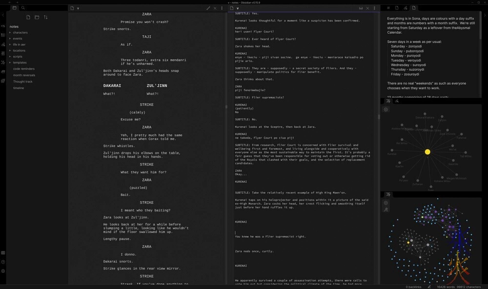 seriously I have no idea and may only think I have some idea of what I’m doing now x_xI’m not sure what my “normal” view of the notes vault is going to be like at this stage, the two long panes as seen here will probably be for script writing (unless the fountain plugin becomes able to use live preview) and I have a setup similar to my roleplaying notes for when I’m putting scenes into the timeline, but presumably at some point it’s just going to be used for reference maybe?! x_x