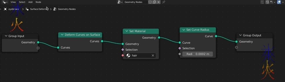 It took me literal days to get that screenie as my computer kept crashing while trying to render. I was initially using the node system I bought for the hair for the eyebrows and eyelashes as well (what’s in the earlier screenie) but that node tree seems to be missing the Deform Curves on Surface node. I did slip it into the end of the node tree before the group output but there were some oddities happening with the deformation that I wasn’t sure how to deal with so I just popped out this massively simplified thing with no child hairs instead.