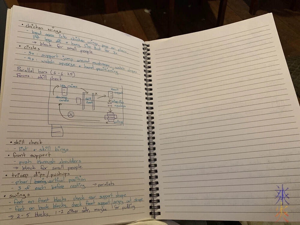 the notebook is partly an excuse to buy cute notebooks and mostly because I’m intending on taking it home over the weekend to transcribe the week’s lesson plans and leaving it there during the week in the unlikely event that I can’t make it or am running late, then whoever is subbing can just grab the notebook out of the cupboard and use the lesson planI think I’m going to have to put the drills and their equipment requirements in a table to save space but that’s more formatting issues that’s getting kicked down the road to deal with next week.