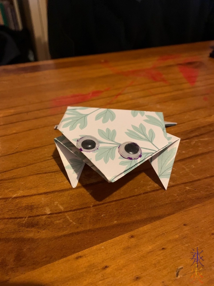15yo was telling me about a kdrama (I think) that she’s been watching where one of the characters makes another character an origami frog as a good luck charm but the receiving character wasn’t sure what it as as it was apparently very badly made. It put her in the mood to do some origami, she found the ancient scrapbook paper and I think had to look up instructions, and made a hopping frog. And googly eyes because they make everything better.