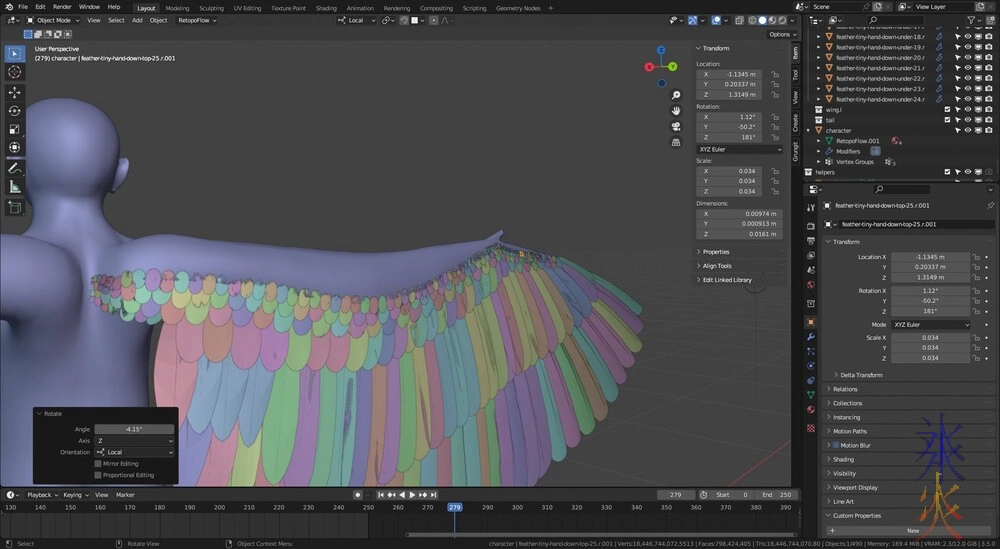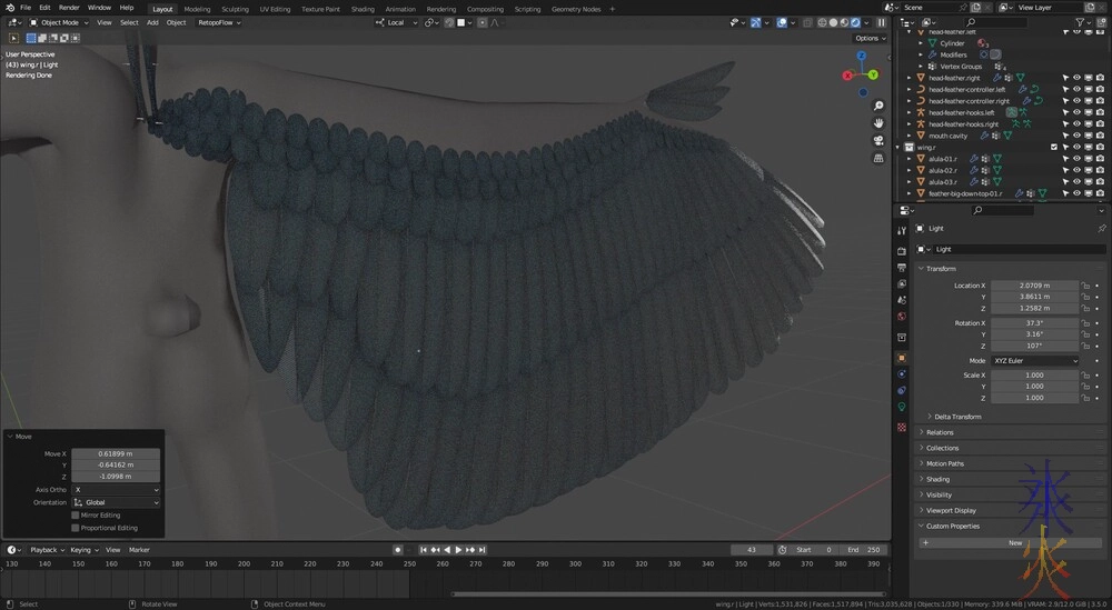 Of course readjusting the wing (which I kind of just kept doing after initially fixing the topology fubar) made me have to readjust the feathers on that side (the underside looks fine) so that took up a fair bit of time otherwise I would have made slightly more progress than I did.