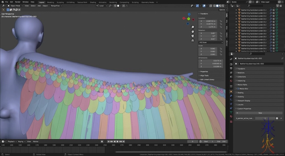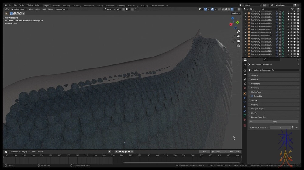 The feathering hell continues and I continue wondering if there was a better way to do it, if geonodes would have solved all my problems if only I was smart enough to get a handle on it, whether or not it’s “right” and whether or not I actually care any more as long as it looks okay, and whether or not I’m going to seriously regret not caring now down the line and if it will come to bite me later.