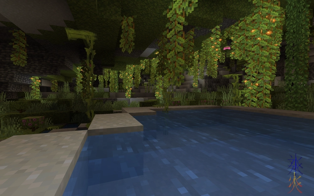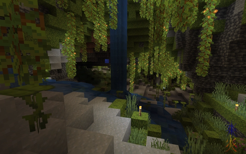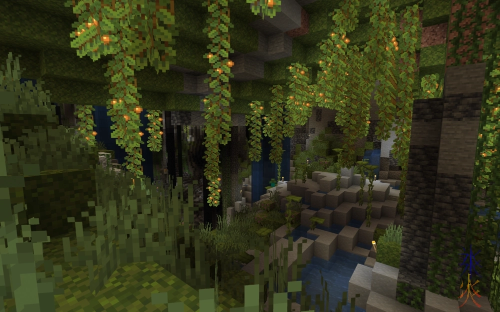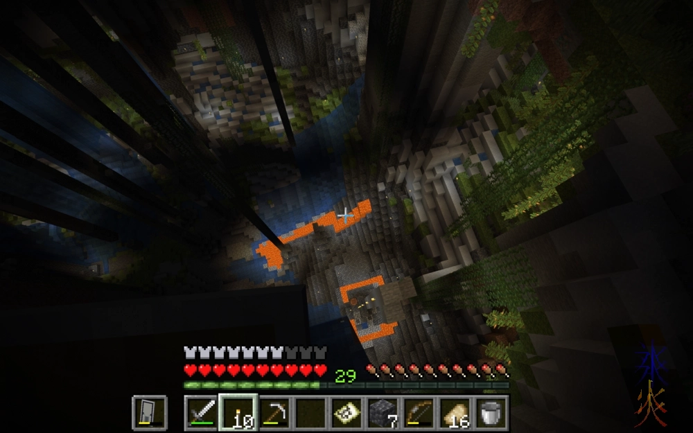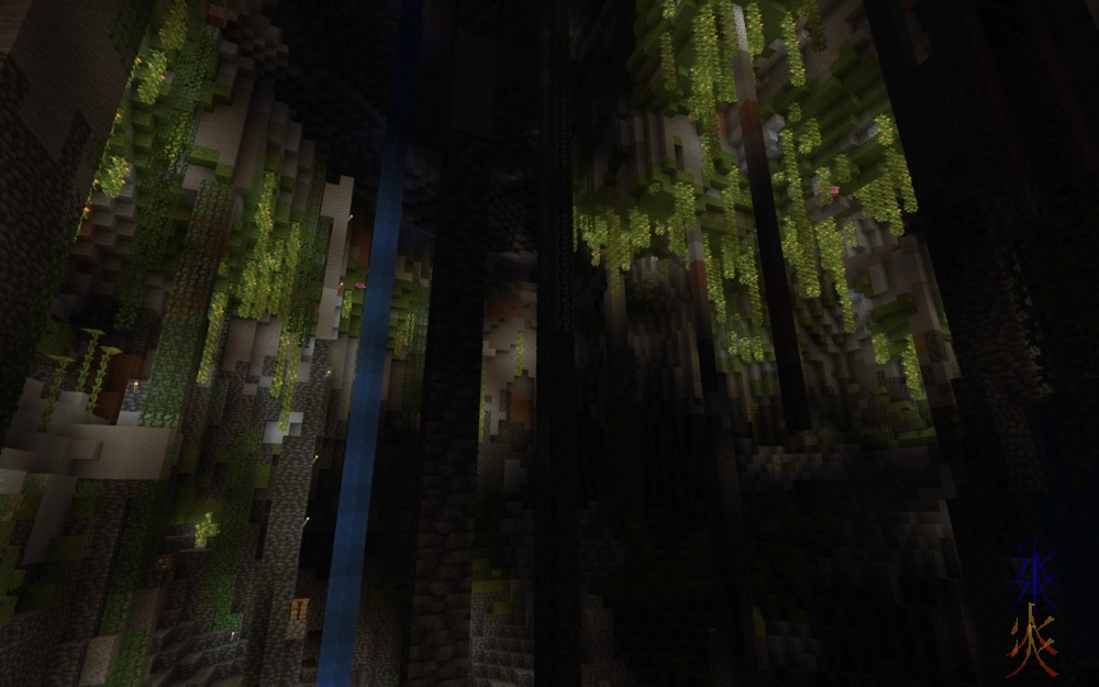 While I was doing this, sibling dearest was gallivanting in the wilderness (I knew roughly where she was from description as we both accidentally generated maps from the base village, but now we know how to clone locater maps so we can actually see each other) and found a massive lush cave.