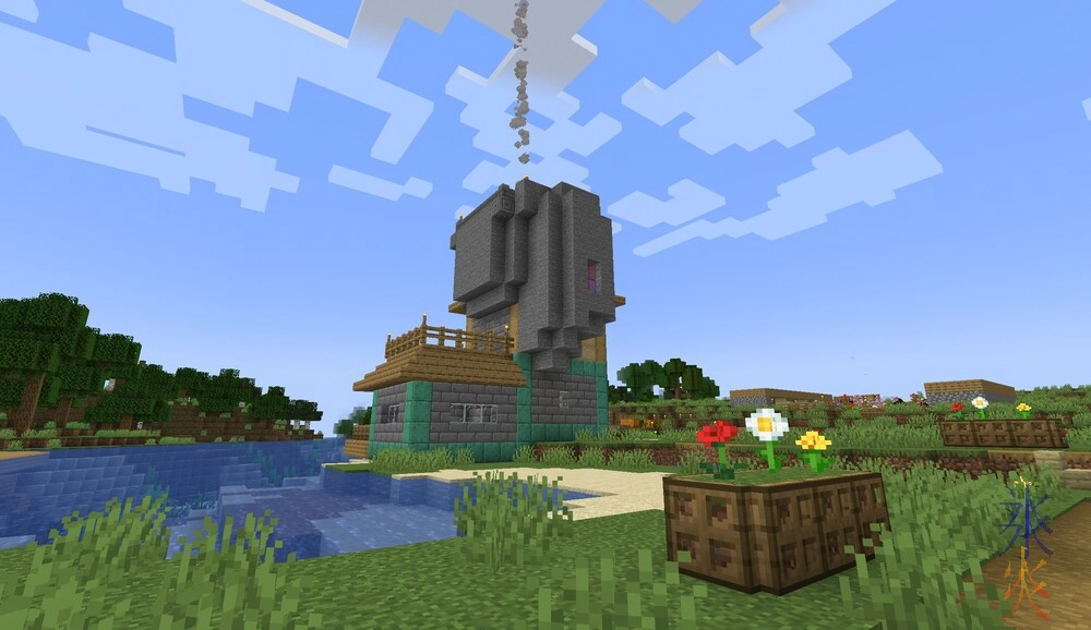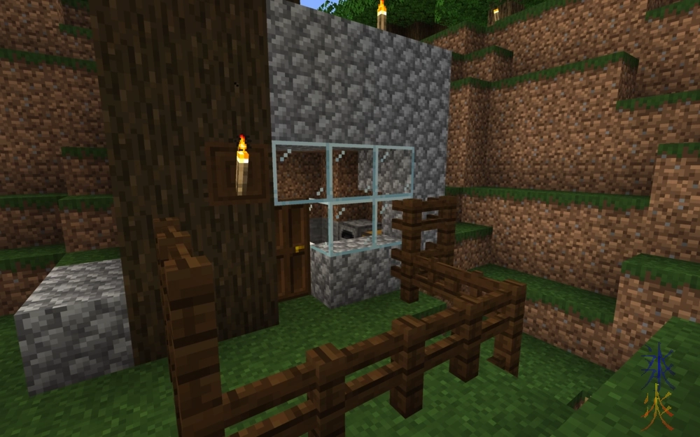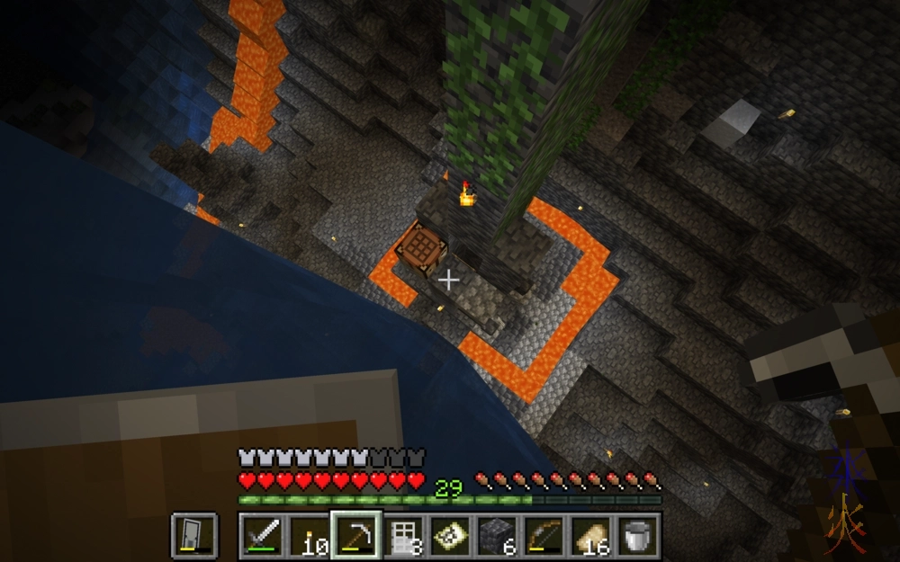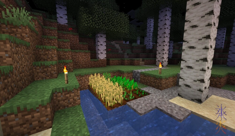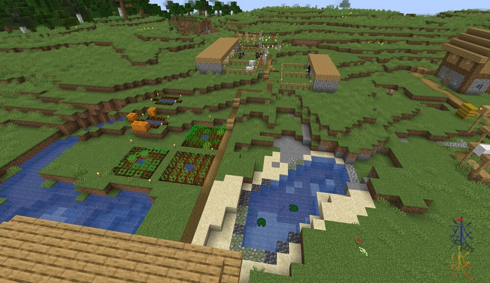 While I like building bases, sibling dearest just likes to wander off so while I was doing this she was already exploring, and found a good village not that far from the spawn point in the grand scheme and harassed me over there. I dropped in long enough to steal some carrots and possibly potatoes and set up the little farm at the Spawn Camp before heading back to build a main base at the village.