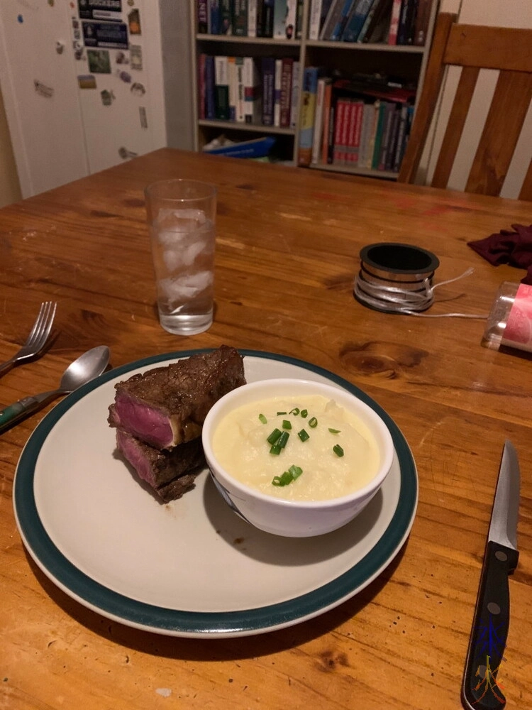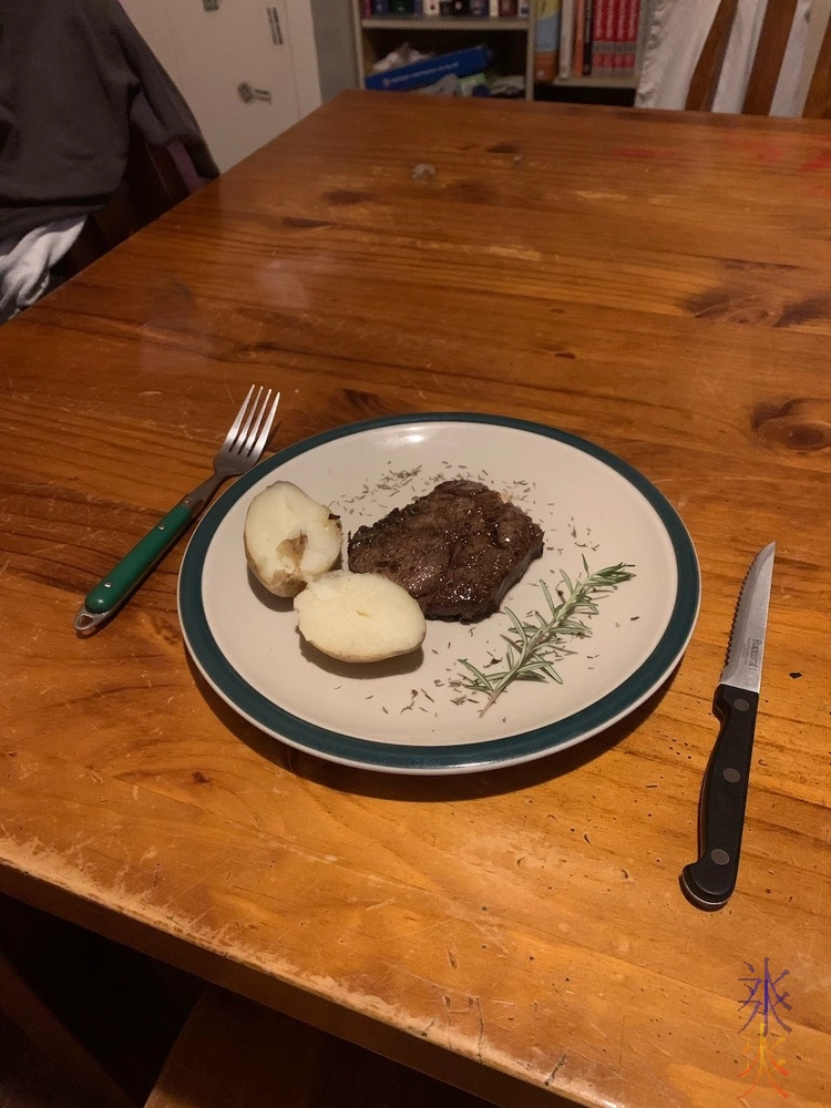 14yo was in charge of cooking dinner one night and apparently really wanted steak. He continues to try to up his presentation game, and also had his first go at baked potatoes.