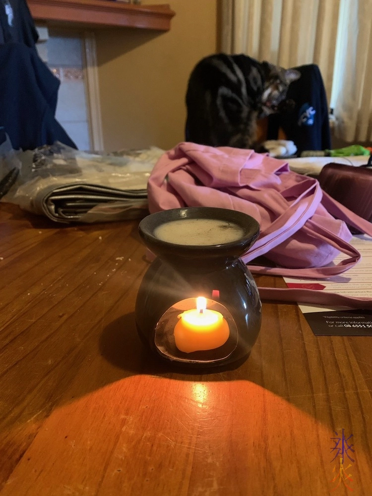 After all that he had a few bits of leftover wax so one small bit went into the sewing box so I could wax thread (which has helped snarl reduction) and the rest went into a tealight candle which doesn’t last for very long but does candle things when it is lit.