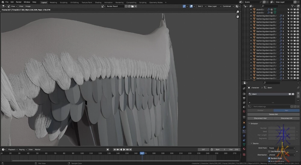 I tried keeping polygon feathers for the bigger down and a higher number of very thin child hairs for the smaller down. Once again it didn’t look terrible from a distance.