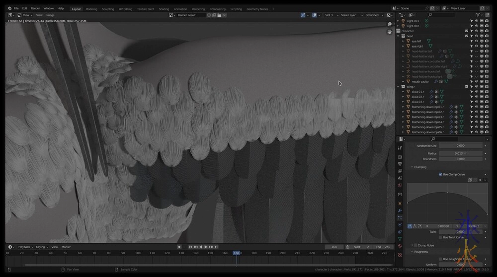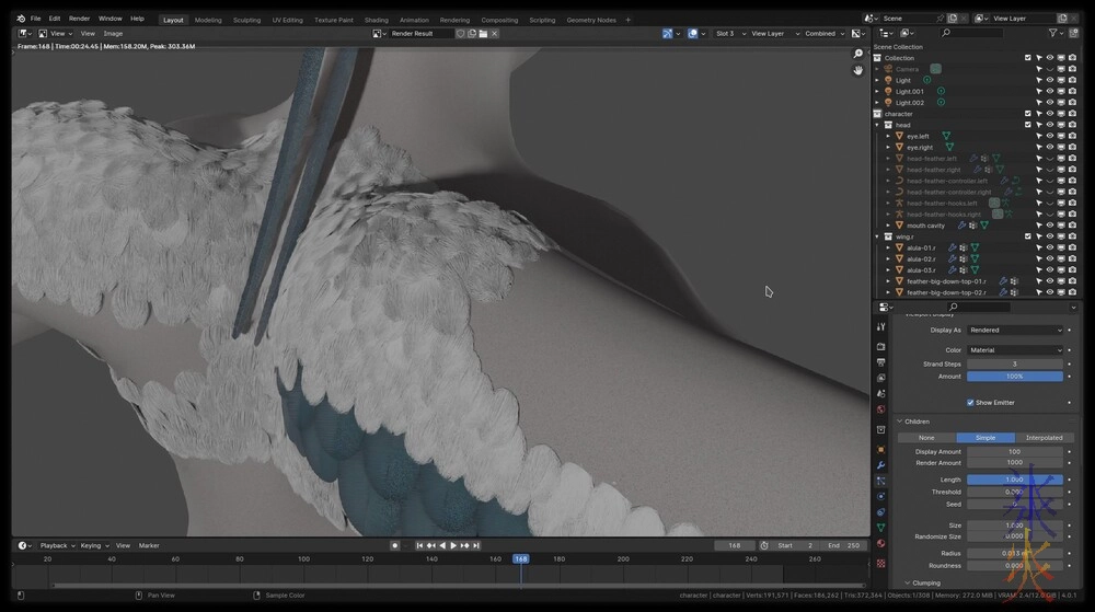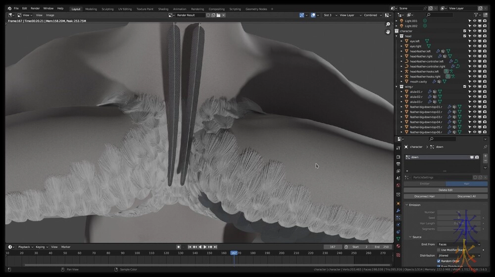 I really, really, really should be doing separate systems for the body and the wings but I’ll fix it later (as there will probably be something better to fix/redo it with later) but meanwhile fortuitously the edge transitions to skin will actually look fine as the child hairs from the top looks conveniently like fluffy down (sadly it didn’t work upside down both ways I tried it but this is fine).
