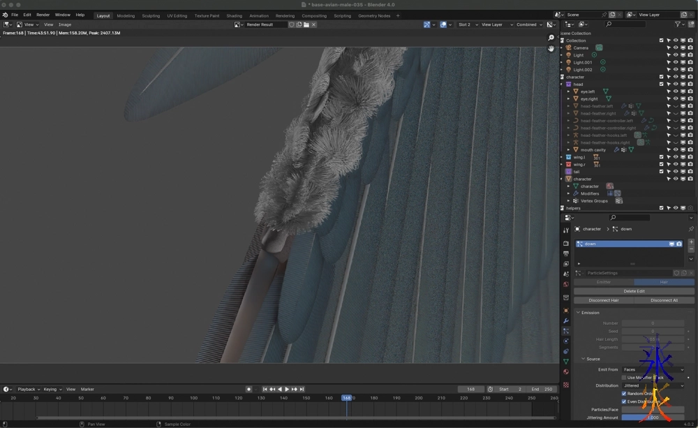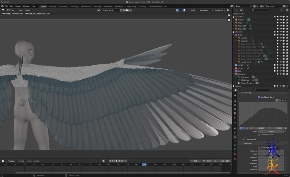 I decided to leave off feathering the back and making the tail til I’m back at the big rig as my poor little laptop is seriously overheating and throttling and generally not happy about anything. I don’t even want to attempt rigging.