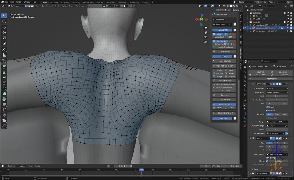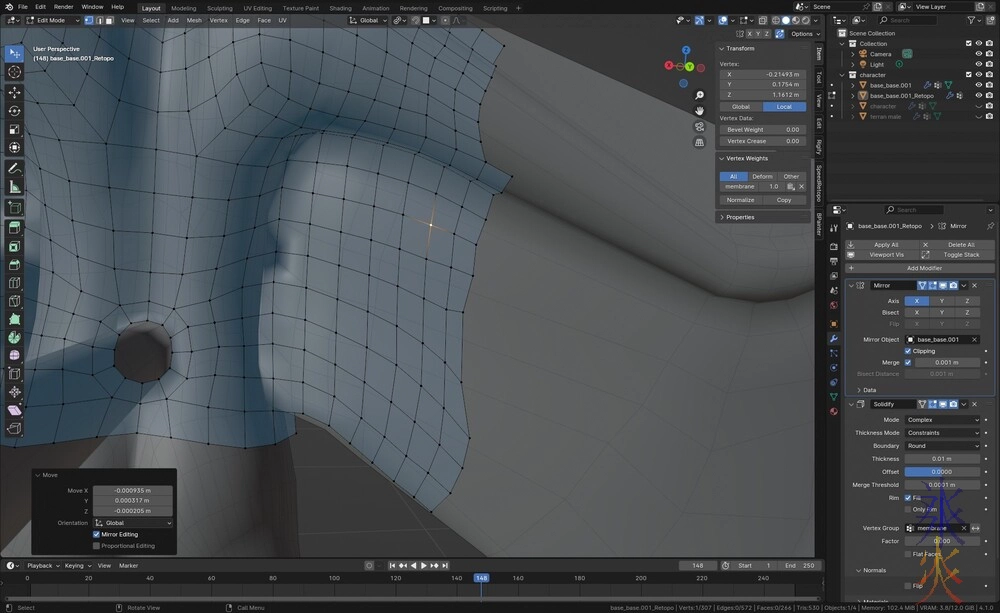 My main aim at the moment is obsessively trying to keep the membranes square as they’re basically going to act like cloth (even though I’m not going to apply cloth dyanmics, there is a non-zero chance they’ll get a lattice deformer). I can get away with rectangles on the arms as they won’t rotate too much, knowing that they exist will just upset me.