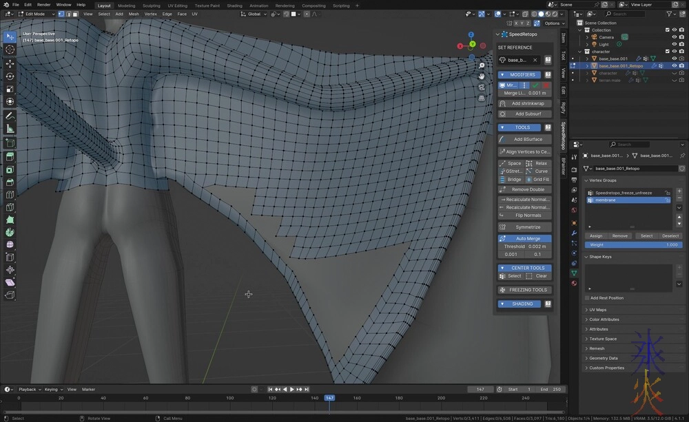 i’m trying really hard to push shenanigan polygons towards the edge of the membrane which may not be the best idea for animation given any problems will be blatantly obvious but I should be able to somewhat mitigate animation issues whereas texturing issues are much more irritating to resolve, so to that end I just want everything as quaddy and even as possible.