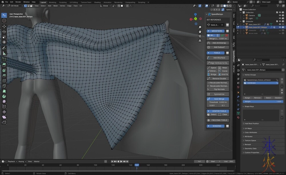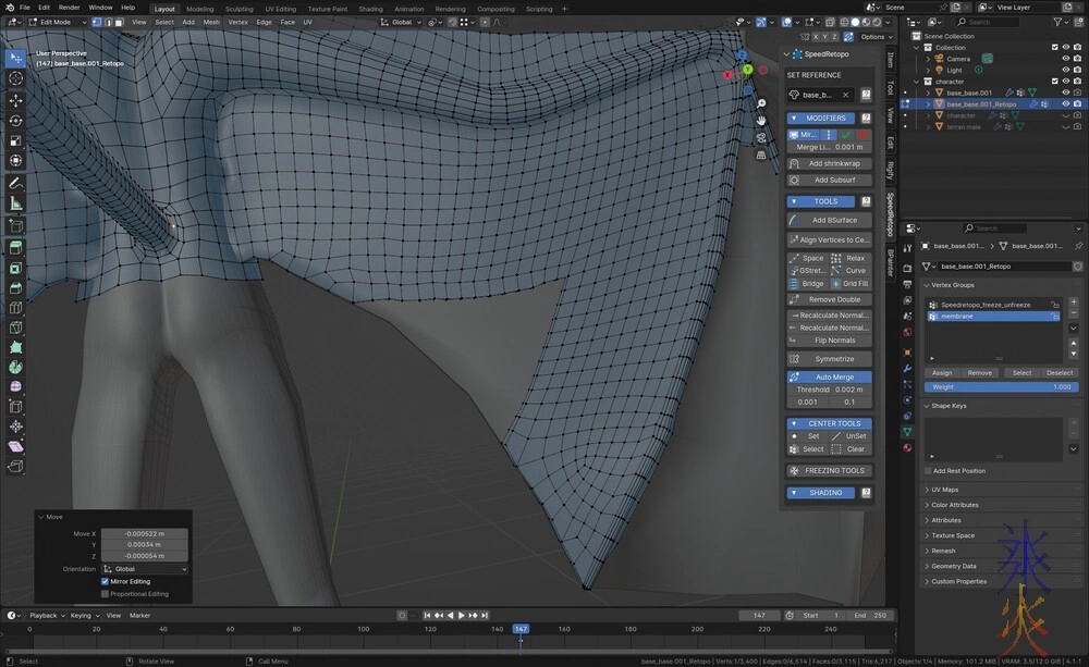 I can never leave well enough alone so I ended up doing this weird loopy nonsense mostly going way too far out of my way to avoid triangles (coz they fold weirdly) and stars (what I call 5+ edges sharing one vertex, not sure what they’re actually called) because brain has decided that the membranes are cloth even though I’m not going to be putting cloth dynamics on them.