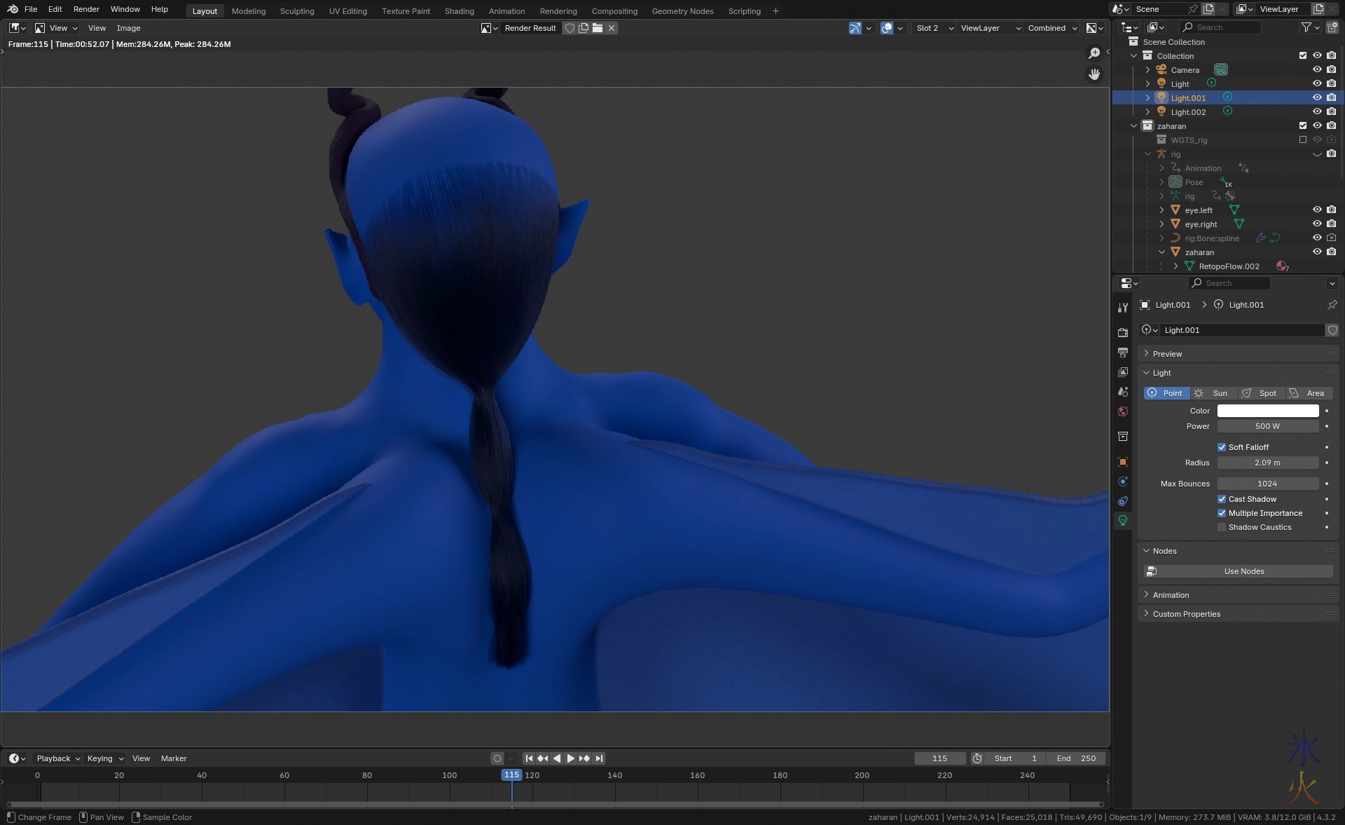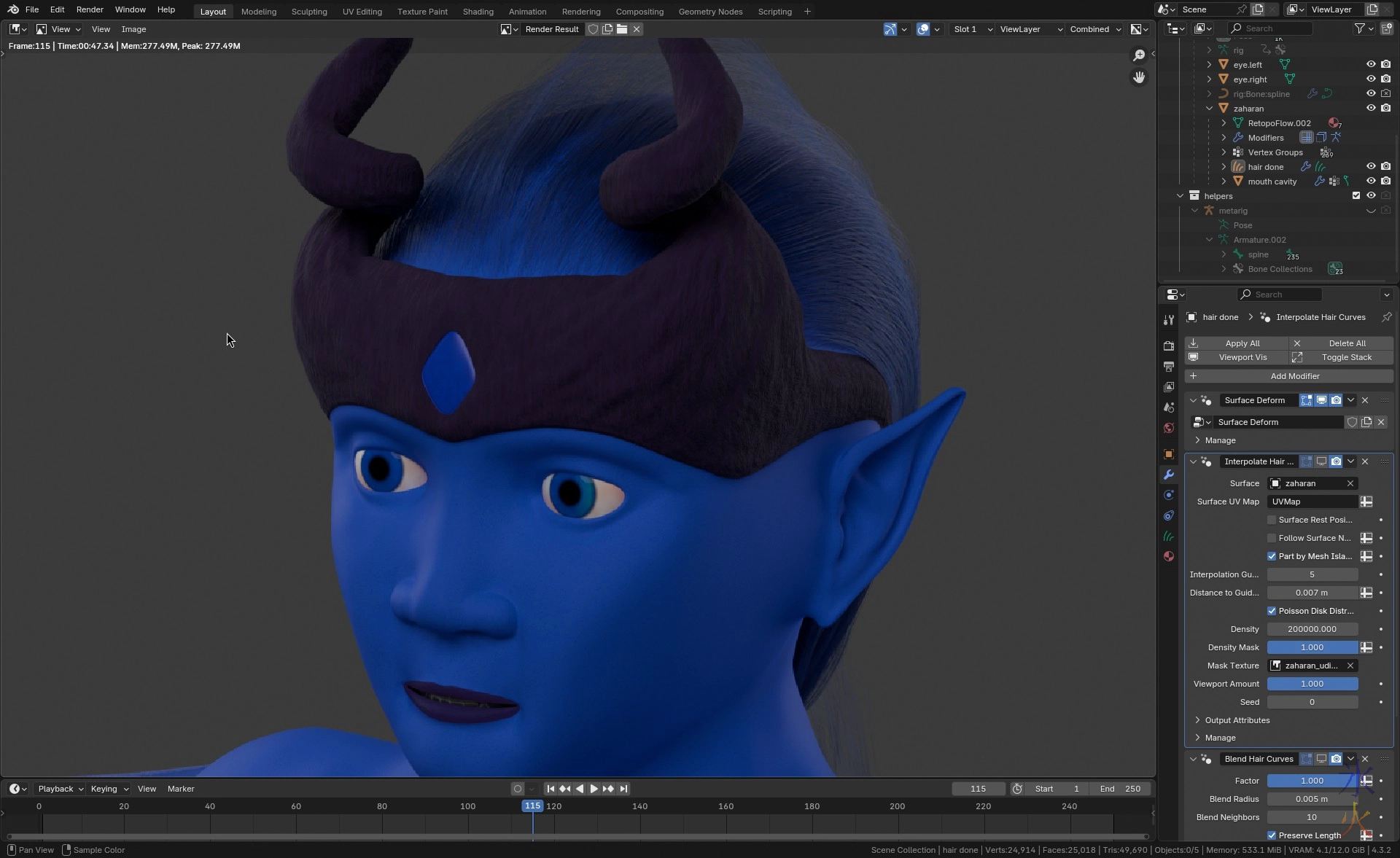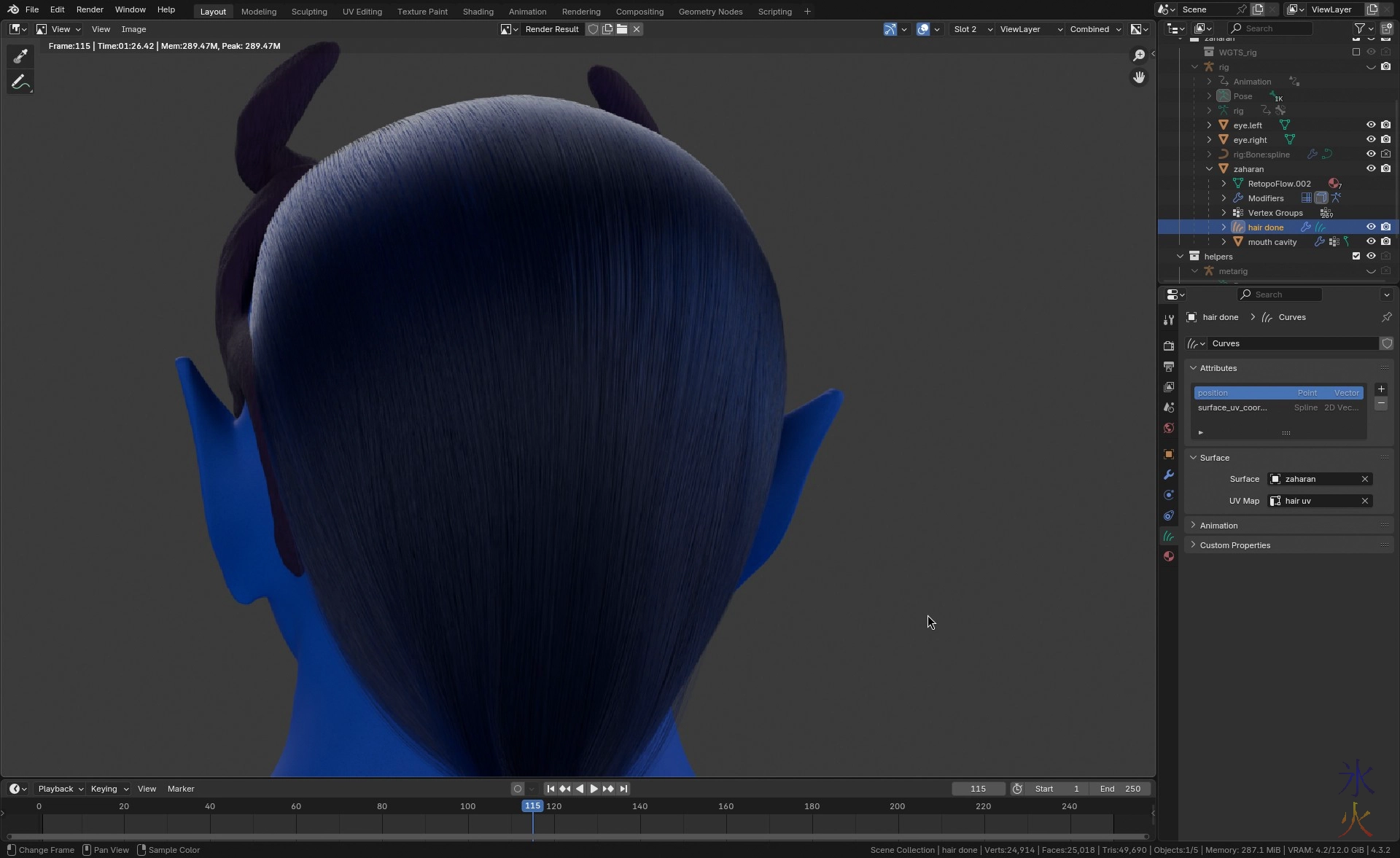 I made the usual mistake of staying up late because “I just want to finish this” and of course there were problems at the end. My test render showed a puff of hair that wasn’t anywhere in the viewport (which I didn’t get a screenie of as it was late and I was mad because I just wanted the hair to be done). Quick search later and apparently it had something to do with subdivision levels so I bumped the viewport levels up to the same as the render levels and lo and behold, the puff appeared.