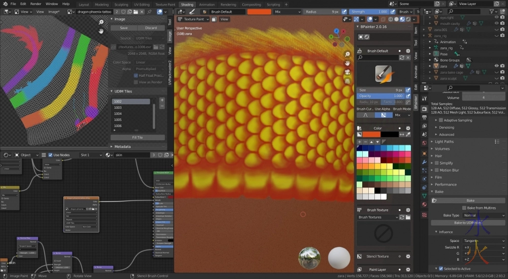After switching back to the colour map, I attacked the shape of the dragon tattoo, adding in these little belly scale segmentation things.