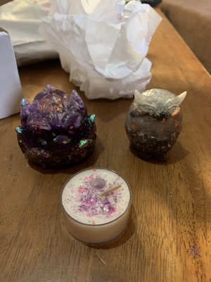 What you’re seeing here are the purple flower that I bought from @bearone for 200 hive, an owl that she said I could have because she loves me (awww _ I did tell her I wanted to buy one when she was ready to sell them) and a candle that made me really glad I was extremely careful about unpacking the box because I had no idea it was in there. It has a really nice smell that was slightly overwhelming when I first opened the box (it was a small box and I thought she just sprayed essential oil into the box to make it nice for the recipient when they received their goods but nope bonus scented candle XD).