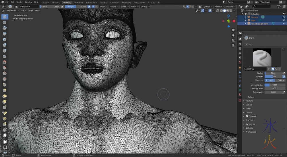 The areas I’ve cleaned up have got bigger triangles/more grey area, black bits are super dense mesh. I did actually do part of the face but from quite close, it was a lot darker than that before. The blotchy spots are the bits that were giving me grief in 3d Coat. Sometimes if I go over them enough times with the clean clay brush (doesn’t seem to matter what the setting is) they sometimes will eventually separate from the main mesh which will then let me objectify them and delete them when they go to their own layers. Most of the time all that happens is that holes form in the mesh and I can’t always close them and everything gets violently pulled out of shape and then the other side is destroyed. This is what I get for not working with virtual mirrors (because I keep switching sides because sometimes some things are more comfortable on one side than the other).