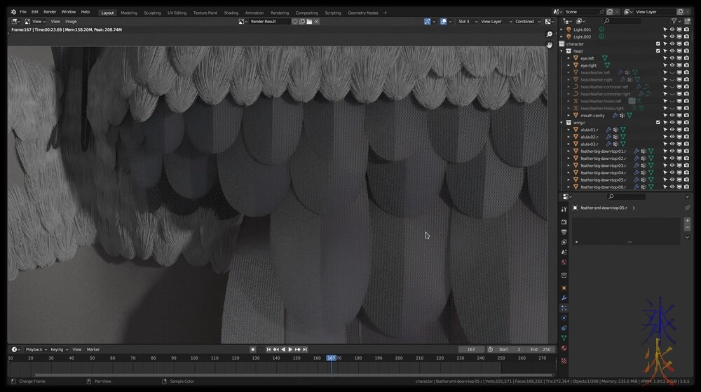 I really, really, really should be doing separate systems for the body and the wings but I’ll fix it later (as there will probably be something better to fix/redo it with later) but meanwhile fortuitously the edge transitions to skin will actually look fine as the child hairs from the top looks conveniently like fluffy down (sadly it didn’t work upside down both ways I tried it but this is fine).