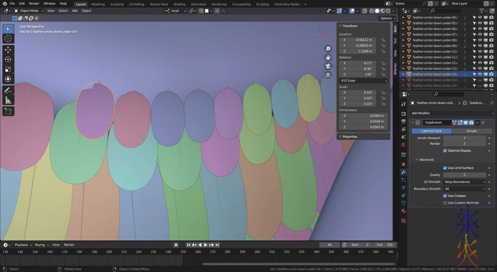 Sunday was just a hard slog of realising that I’d completely munted everything and that the feathers are actually on stalks before going into the skin. I versioned the model to see if doing that would solve some layering problems I’m having.