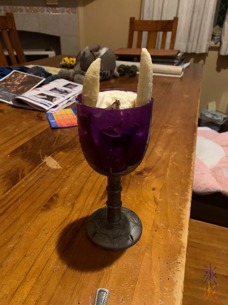 13yo continued on his dessert presentation experiments, jumping on the Halloween bandwagon with this “vampire” themed one (the bananas were meant to be fangs), and the goblet was a prop we’d bought some other Halloween).